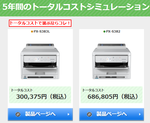 また、耐久性として約30万枚の印刷に耐えることができます。下記の画像はエプソンホームページに載っている比較表になります。左側が今回紹介しているプリンターで、「プリンターの耐久上限である30万枚印刷した時の機器本体代金とインク代」をシミュレーションしたものになります。右側の価格の安い機種を利用した場合よりも、最終的なコストは半分以下になるという結果が出ています。